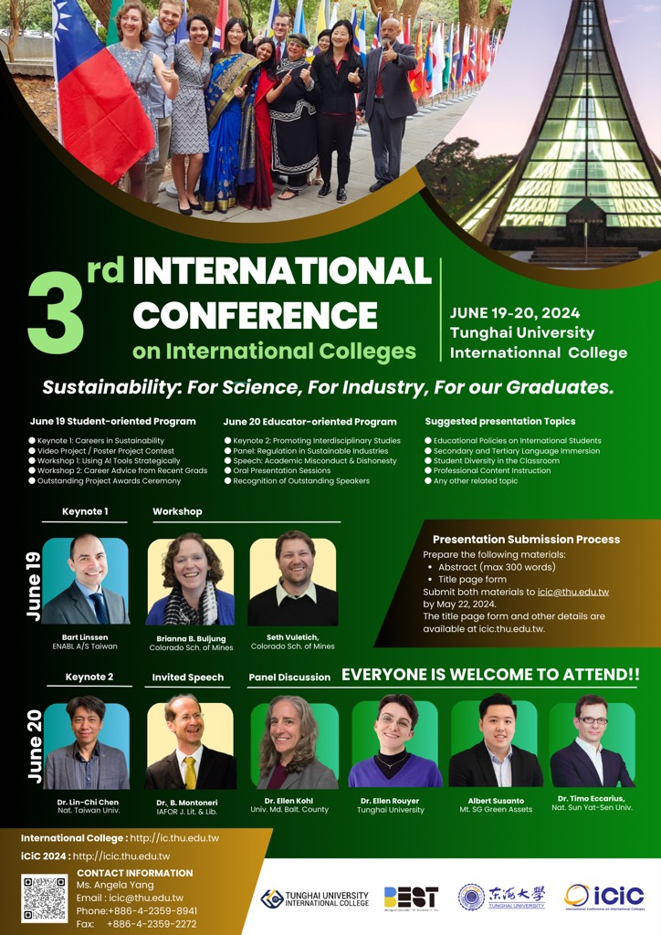 As a new generation enters higher education, universities worldwide are rethinking how students learn and prepare for their careers. Gen Z students came of age in an era defined by digital technologies, global connectivity, and evolving ideas about work and purpose. International colleges can respond to these shifts by offering flexible, interdisciplinary learning environments that connect education with real-world opportunities, while offering their graduates a gateway to internationally mobile careers. We welcome prospective participants to the Tunghai University campus for the one-day ICIC 2025 program, which will be a forum for students, academics, and industry professionals to present their ideas.